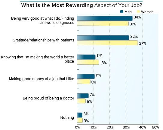 女醫(yī)生和男醫(yī)生略有差別。約三月之一(31%女性和34%男性)醫(yī)生認(rèn)為工作做得好有成就感,更多女性(37%)比男性(32%)認(rèn)為醫(yī)患關(guān)系好是滿意度的一個(gè)主要來(lái)源。