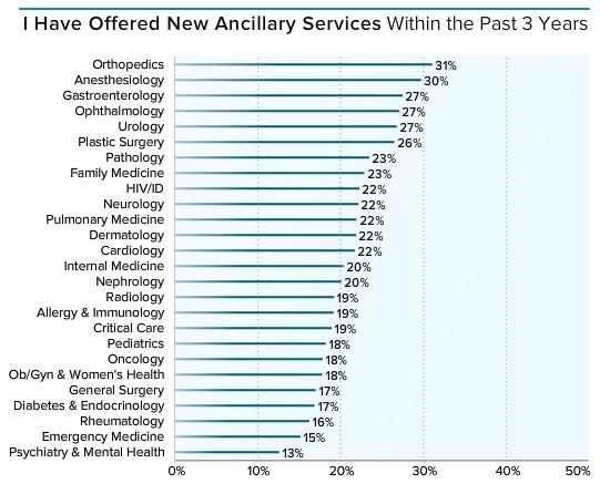 約三分之一(31%)的骨科醫(yī)生提供輔助服務(wù),包括辦公室手術(shù)中心,疼痛中心,MRI,理療,矯形和支撐。麻醉科排在第二位(30%),服務(wù)主要針對(duì)術(shù)后疼痛。