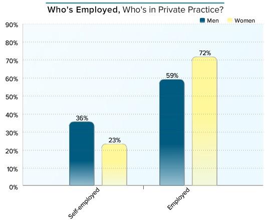 63%醫(yī)生說(shuō)自己被雇傭,不到三分之一(32%)為私人執(zhí)業(yè)。既往就業(yè)調(diào)查發(fā)現(xiàn),2004年醫(yī)院聘用率為11%,2014年已經(jīng)上升到了64%。性別有差異,72%女性和59%男性說(shuō)他們工作是為了一份薪水。36%男性和23%女性是自己當(dāng)老板。