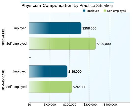 被雇傭的初級(jí)保健醫(yī)生(PCP)工資為189,000美元,而自己?jiǎn)胃傻腜CP工資為212,000美元。不管是哪一種,都比??漆t(yī)生掙得少。