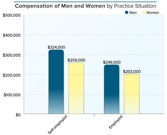 男醫(yī)生(284,000美元)要比女醫(yī)生(215,000美元)掙得多。整體來(lái)講,女醫(yī)生工作時(shí)長(zhǎng)要略低于男醫(yī)生,可能幫忙解釋薪酬較少的原因。此外,更高收入的科室中女醫(yī)生一般較少也導(dǎo)致了差異。