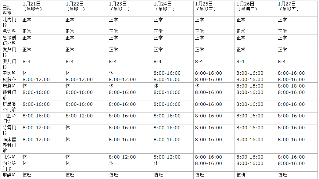 1月21日至23日:生殖遺傳中心上午開診、耳鼻喉科上午開診、口腔科全天開診;產(chǎn)科1月21日上午開診,1月22日至1月23日全天開診;其余各??凭T\,掛號交費請至急診收費窗口。