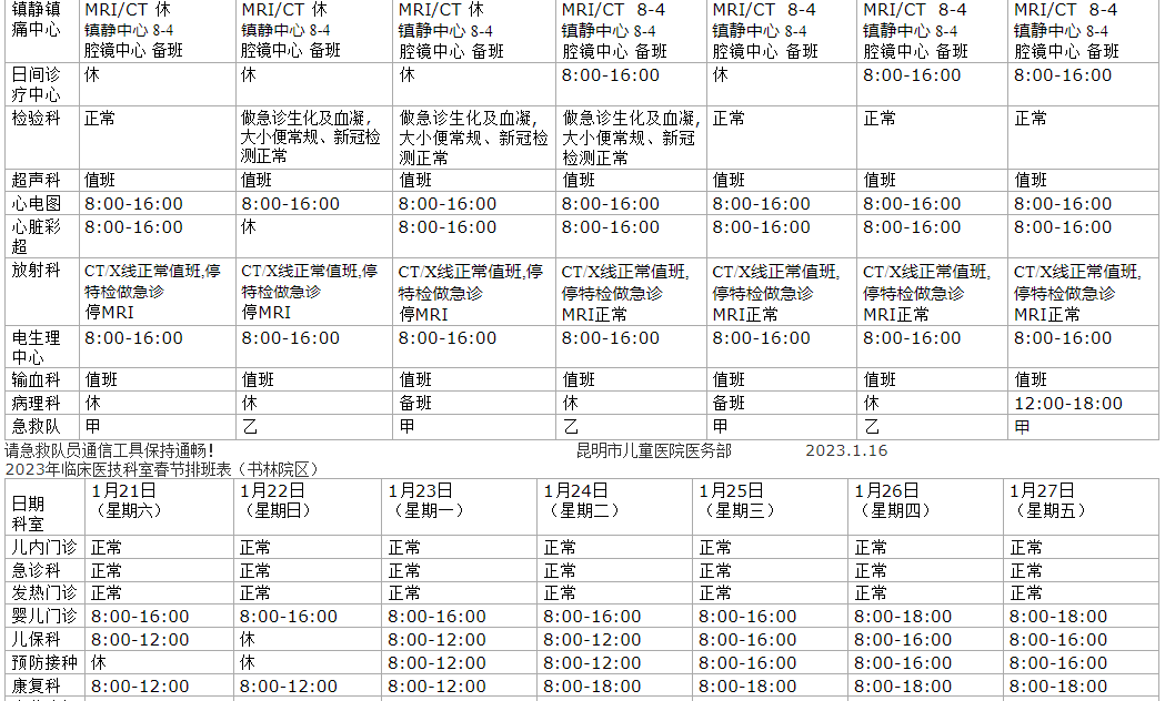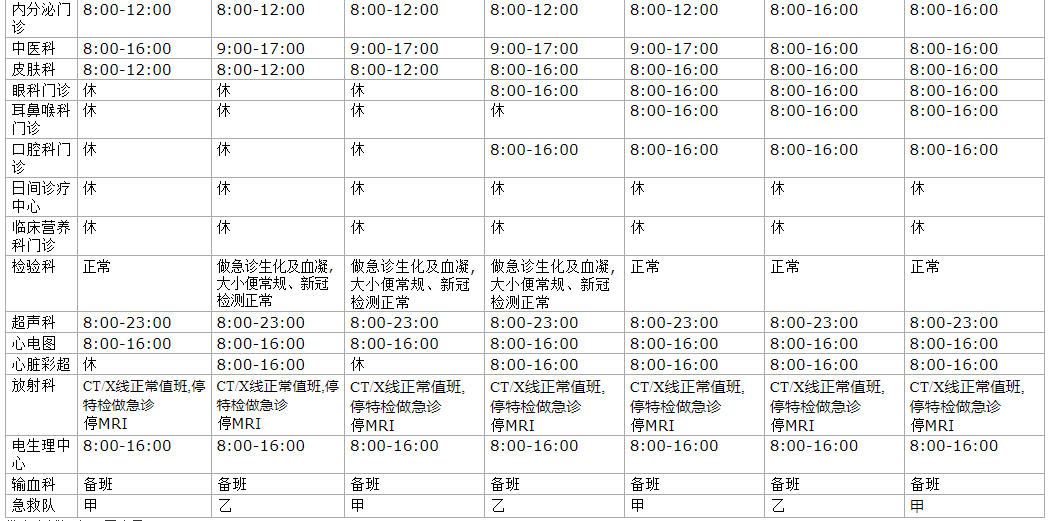 1月21日至23日門診不開診,急診24小時應診;24日至29日門診正常開診,B超、化驗、放射、磁共振、心電圖等各項醫(yī)技檢查正常進行。