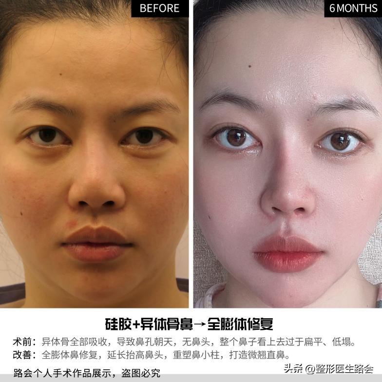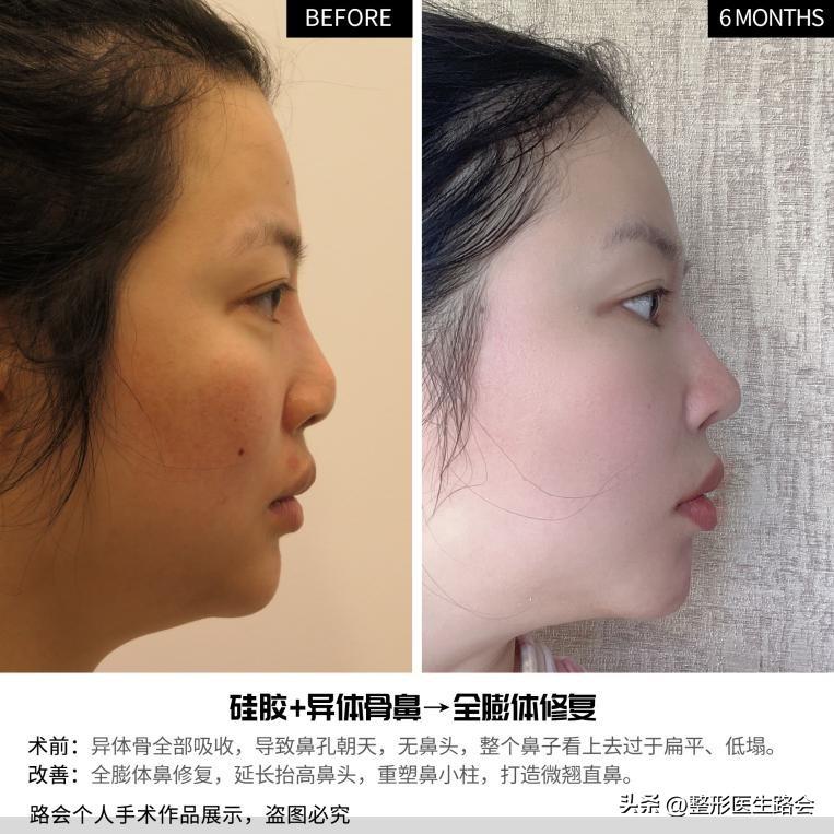 從小我的鼻子就不好看,長大后看到身邊朋友通過“醫(yī)美”變美,我便效仿她人做了“硅膠+異體骨”隆鼻。但隨著時間的流逝,鼻內(nèi)的異體骨吸收,導(dǎo)致鼻孔朝天、無鼻頭,使我整個鼻子看上去“扁平、低塌”,如下圖所示↓↓↓