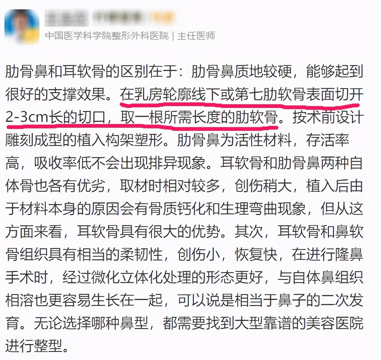 另外,她描述整容項目的字里行間,隔著屏幕都能讓人感覺到疼痛。她做的是做鼻子耳軟內、肋軟骨和膨體手術,是從自己身上取下肋軟骨移植到鼻部。失敗之后又進行了二次手術,兩次間隔時間僅隔了四天。