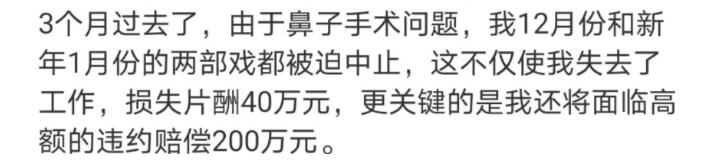 網友替她打抱不平也一邊的同時,也從她的博文里解讀出了很多信息,比如她提到由于手術失敗,令她12月份和新年1月份被迫中止了兩部戲,損失了片酬40萬。紛紛感慨做明星賺錢真容易,一個18線小演員,分分鐘就是40萬。