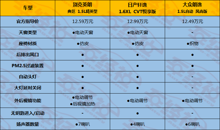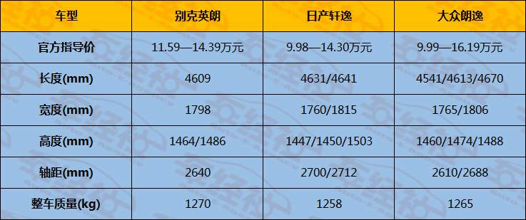 為公平起見,我們選取了價(jià)格接近的3款車型進(jìn)行對比,分別是2020款英朗典范1.5L精英型(12.59萬元)、2020款軒逸1.6XL CVT悅享版(12.99萬元)、2019款朗逸1.5L自動風(fēng)尚版(12.49萬元)。