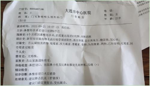 來(lái)到大連后,鼻子疼得難受的小王, 先后到大連中心醫(yī)院、大連醫(yī)科大學(xué)附屬第一醫(yī)院。小王說(shuō),大夫看過(guò)后,告訴她不能老打抗生素,而且必須要盡快把隆鼻的假體取出來(lái),把里面的炎癥消掉。如果要修復(fù),得養(yǎng)一年以上,才能做二次手術(shù),修復(fù)的費(fèi)用,也需要7萬(wàn)左右。