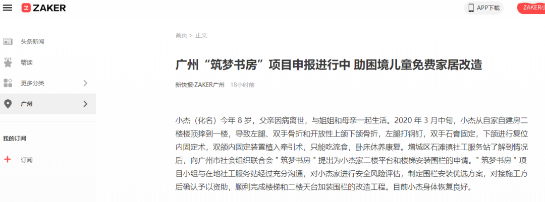 小杰(化名)今年 8 歲,父親因病離世,與姐姐和母親一起生活。2020 年 3 月中旬,小杰從自家自建房二樓樓頂摔到一樓,導(dǎo)致左腿、雙手骨折和開放性上頜下頜骨折,左腿打鋼釘,雙手石膏固定,下頜進(jìn)行復(fù)位內(nèi)固定術(shù),雙頜內(nèi)固定裝置植入牽引術(shù),只能吃流食,臥床休養(yǎng)康復(fù)。增城區(qū)石灘鎮(zhèn)社工服務(wù)站了解到情況后,向廣州市社會(huì)組織聯(lián)合會(huì) " 筑夢(mèng)書房 " 提出為小杰家二樓平臺(tái)和樓梯安裝圍欄的申請(qǐng)。" 筑夢(mèng)書房 " 項(xiàng)目小組與在地社工服務(wù)站經(jīng)過充分溝通,對(duì)小杰家進(jìn)行風(fēng)險(xiǎn)評(píng)估,制定圍欄安裝優(yōu)選方案,對(duì)接施工方后確認(rèn)予以資助,順利完成樓梯和二樓天臺(tái)加裝圍欄的改造工程。目前小杰身體恢復(fù)良好。