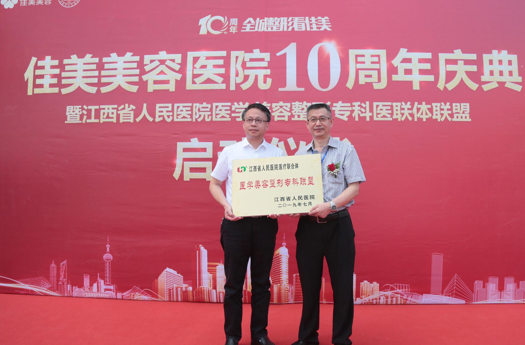 進(jìn)入到簽約儀式環(huán)節(jié),南昌佳美美容醫(yī)院代表高院長與李小林共同上臺(tái)進(jìn)行簽約,同時(shí)李主任為南昌佳美美容醫(yī)院授牌,南昌佳美美容醫(yī)院正式加入江西省人民醫(yī)院醫(yī)學(xué)美容整形??漆t(yī)聯(lián)體聯(lián)盟!