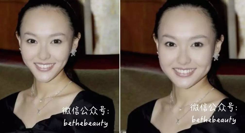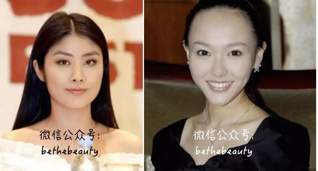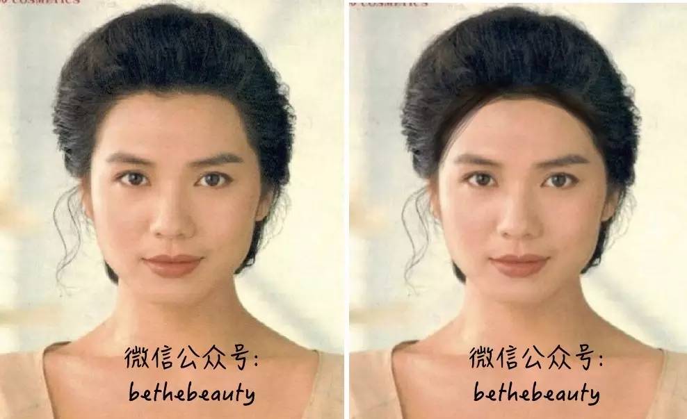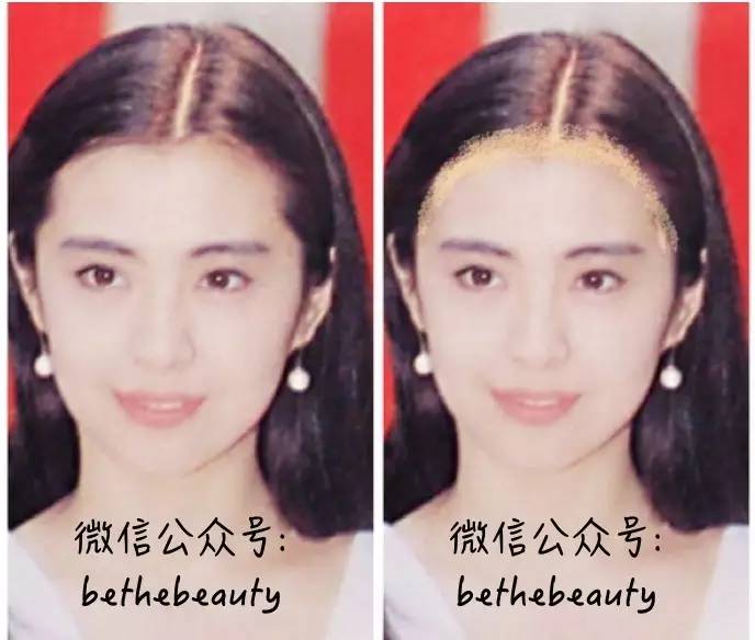 鐘楚紅其實是偏方形的發(fā)際線(左圖),但這也跟她的方腮幫相得益彰,而如果生搬硬套弄個圓形發(fā)際線(右圖),腮幫子反而會顯得更方。