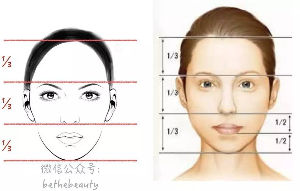 審美標準:三庭均等(發(fā)際線至眉頭高點(上庭),眉頭高點至鼻頭(中庭),鼻頭至下巴尖(下庭)的長度應該大致相等。