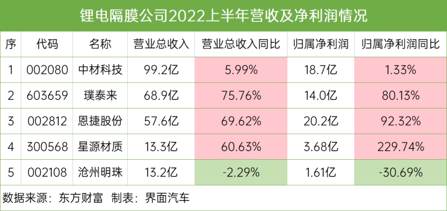 界面新聞梳理了5家鋰電隔膜上市公司半年報發(fā)現,僅滄州明珠一家公司營收和凈利雙降,其余4家公司均實現營收和凈利雙增長,其中恩捷股份凈利同比增長超九成,星源材質凈利同比高達229.74%。