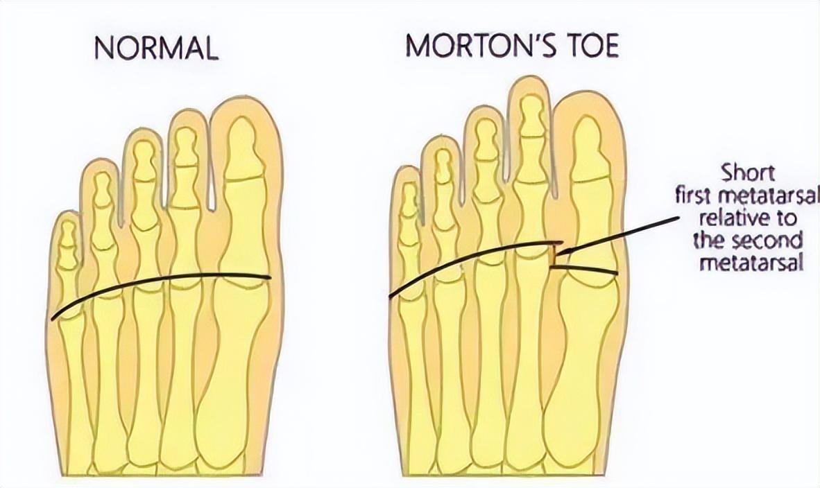 在外觀上,患“莫頓腳趾”的人第二腳趾長度長于大拇腳趾,是第二跖骨比第一跖骨長造成的。