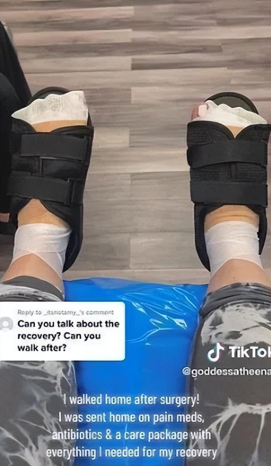 之后視頻切到手術(shù)結(jié)束,雅典娜的腳已經(jīng)被紗布包裹,穿上了術(shù)后鞋。 診所交給她一些止痛片、抗生素,還有一個(gè)裝滿康復(fù)用品的護(hù)理包,然后雅典娜甚至自己步行回了家…
