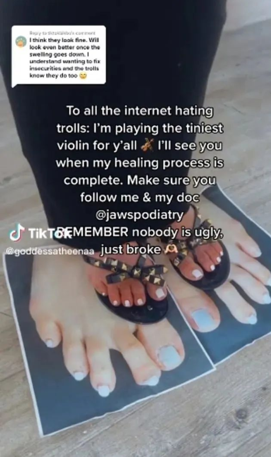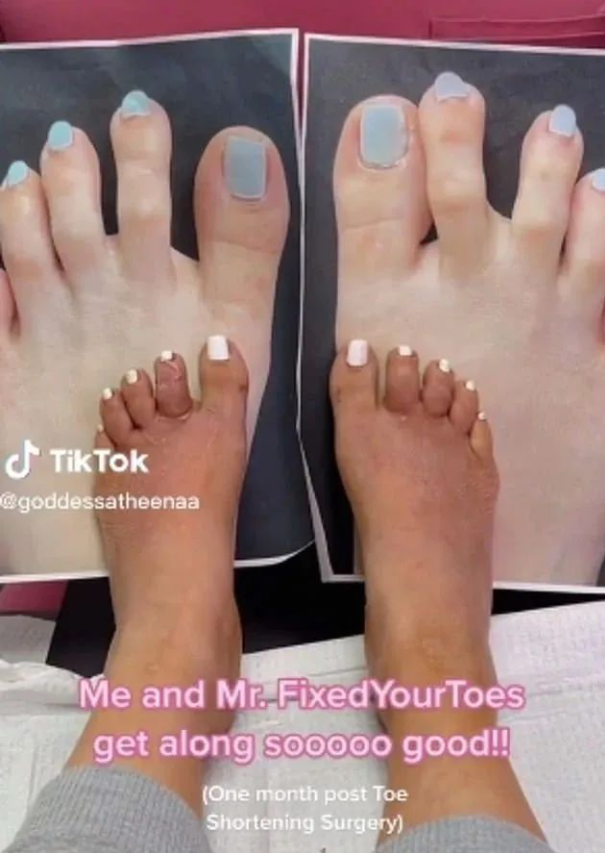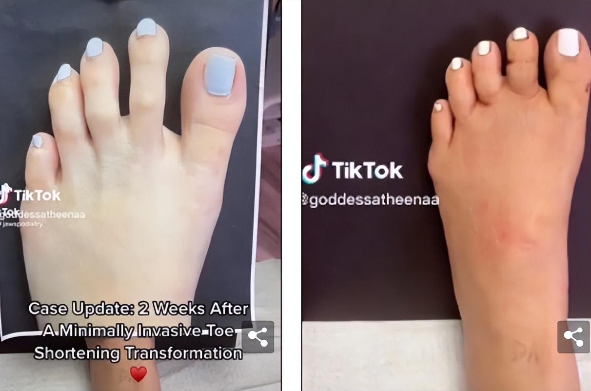 據(jù)她描述,恢復(fù)期相當(dāng)順利,她還把腳趾整形和隆胸手術(shù)比較了一番,第一天疼痛“不算太嚴(yán)重”,她的腳趾只感到“壓力和緊張”…