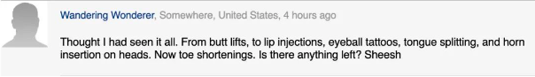 “我以為我已經(jīng)看遍了。從臀部提升術(shù)到唇部注射、眼球紋身、舌頭分叉和頭上植角?,F(xiàn)在又有腳趾縮短。還有別的嗎?媽的…”