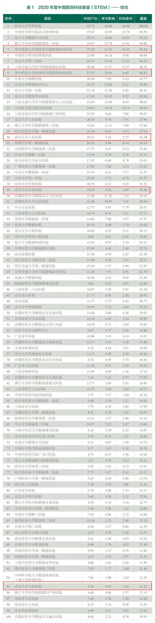 華中科技大學(xué)同濟(jì)醫(yī)學(xué)院附屬同濟(jì)醫(yī)院(第5名)、華中科技大學(xué)同濟(jì)醫(yī)學(xué)院附屬協(xié)和醫(yī)院(第9名)、武漢大學(xué)人民醫(yī)院(第20名)、武漢大學(xué)中南醫(yī)院(第29名)、武漢大學(xué)口腔醫(yī)院(第95名)登上綜合榜單。