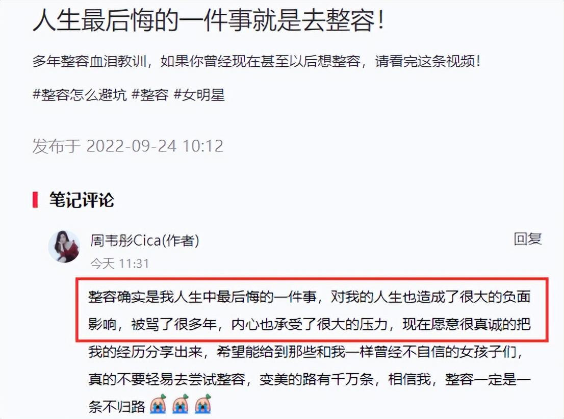 9月24日,女星周韋彤在社交平臺上發(fā)文,大方承認(rèn)自己整容,并且與大家分享她曾經(jīng)為了變美踩過的坑,此事引起網(wǎng)友熱議。