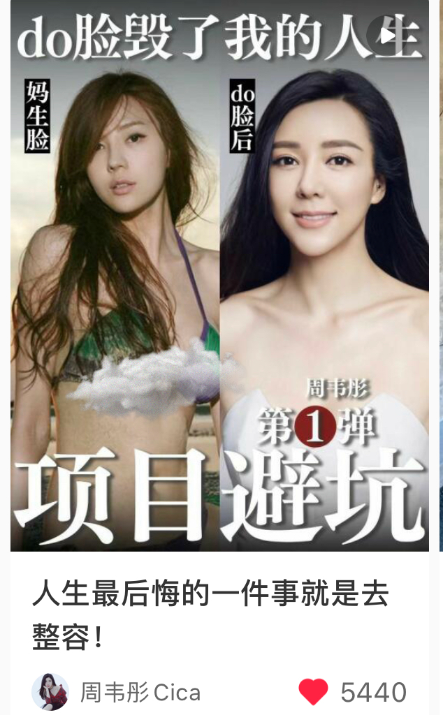 一開始,周韋彤的身材、顏值高,屬于很有辨識度的美女,在模特圈里氣質(zhì)特別出眾。然而,現(xiàn)在她卻完全變成了“網(wǎng)紅臉”,丟掉了原有的特色,只剩下無盡的后悔,周韋彤直言:“do(動)臉毀了我的人生?!?/p>