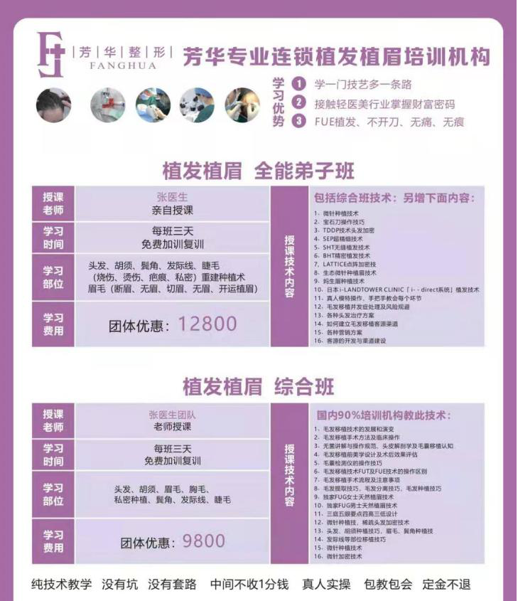 以麥子植發(fā)培訓的“植發(fā)植眉全能弟子班”為例,學習時間為3天,學習部位包括頭發(fā)、胡須、鬢角、發(fā)際線、(燒傷、私密)重建種植術、眉毛等,費用原價118000元,現(xiàn)需9800元。