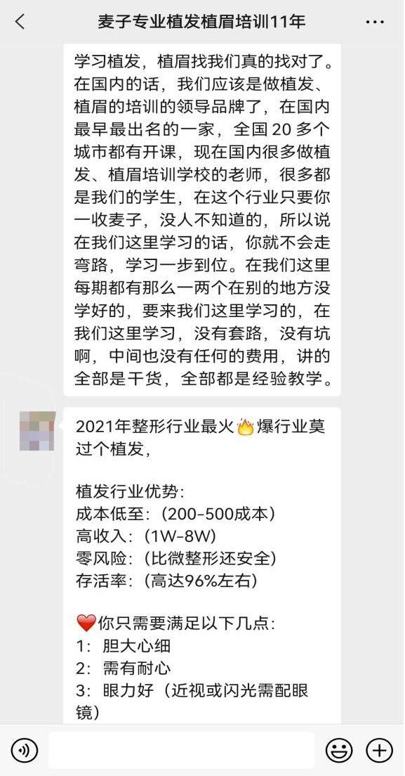 “2021年整形行業(yè)火爆的莫過于植發(fā)”,貝殼財經(jīng)記者在多個網(wǎng)頁看到總部位于深圳的“麥子植發(fā)培訓”,其負責培訓的工作人員告訴記者,植發(fā)行業(yè)一個客戶的成本可能只需要200-500元,但收入可以達到1萬元到8萬元,并且零風險,比微整形還,植發(fā)成活率高達96%。