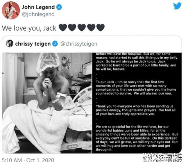 今年8月才通過丈夫傳奇哥John Legend 新歌MV《Wild》宣布迎來第三胎,今天卻在社交媒體上宣布,孕程僅僅24周左右的她因?yàn)檫B續(xù)一個(gè)月的出血不斷,不得不放棄孩子,進(jìn)行了引產(chǎn),并給這個(gè)沒能長(zhǎng)大的男孩取名Jack。