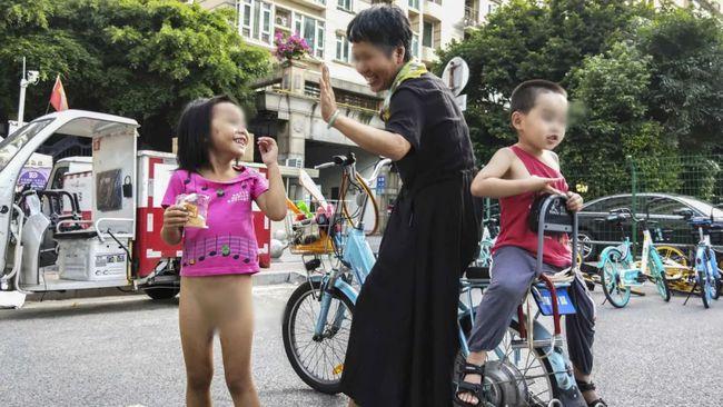 騎車載著小孫子的阿婆路過,注意到了這個跟孫子年齡相仿的半裸女孩。