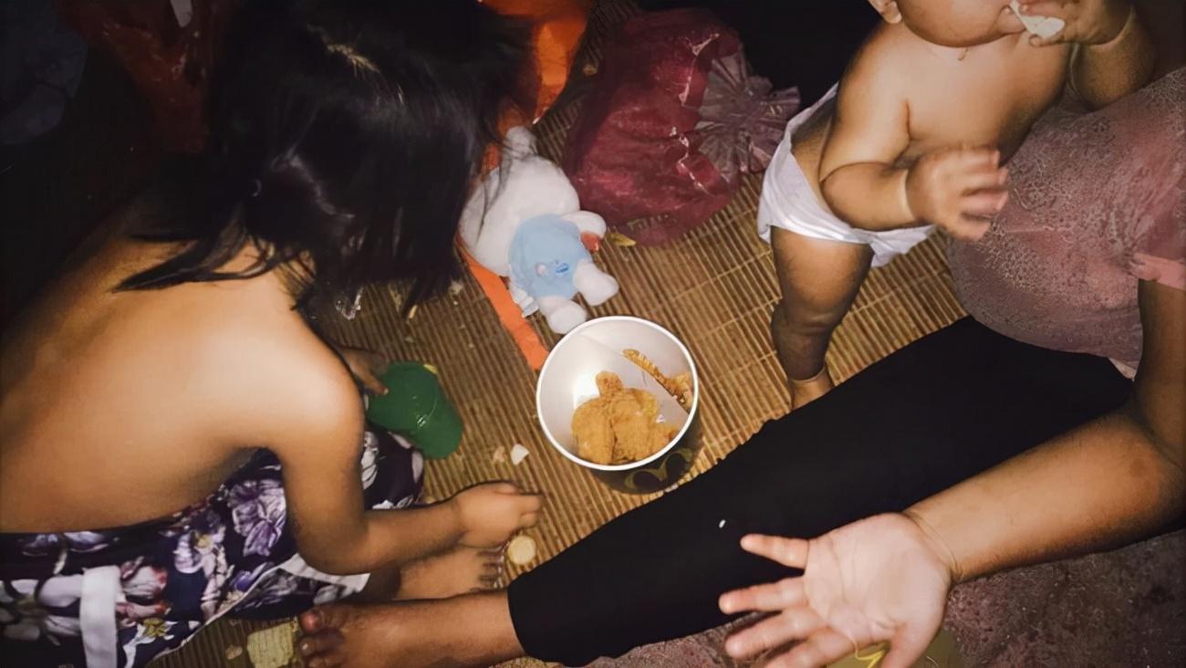 母女三人坐在地上吃路人送的快餐