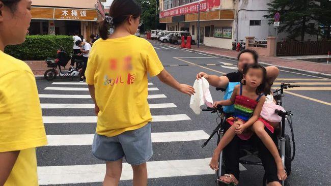余曉芳帶著兩個女兒在街頭,引路人圍觀