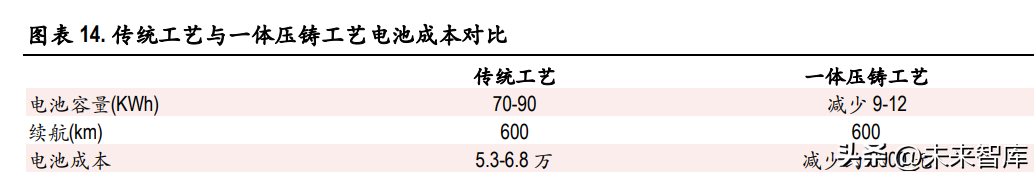 一體壓鑄技術(shù)的降本作用主要體現(xiàn)在兩方面,一是降低電池成本,二是降低車身制造過程中的單位 成本。中短期內(nèi),受到一體壓鑄技術(shù)初期投入龐大、大部分新能源汽車品牌單一車型銷量難以穩(wěn)定 滿足一體壓鑄應(yīng)用經(jīng)濟性、良品率還在爬坡的影響,一體壓鑄技術(shù)降本的穩(wěn)定性有待提高。長期看, 隨著新能源汽車單一車型銷量提高和一體壓鑄技術(shù)更加成熟,一體壓鑄技術(shù)將發(fā)揮出更強大的降本 作用。 同等續(xù)航里程下,一體壓鑄使電池成本下降約 6000 元。根據(jù) autocarweekly 測算,600mk 續(xù)航里程能夠 消除消費者的里程焦慮,600km 續(xù)航一般對應(yīng)電池容量 70-90KWh。參考特斯拉發(fā)布會數(shù)據(jù),特斯拉 預(yù)計完成下車身一體化后續(xù)航將增加 14%。那么在同等續(xù)航里程下,電池容量可減少 9-12KWh,根據(jù) 則言咨詢數(shù)據(jù),近一年來磷酸鐵鋰電池均價為 0.58 元/Wh,經(jīng)測算可實現(xiàn)約 6000 元的電池降本。