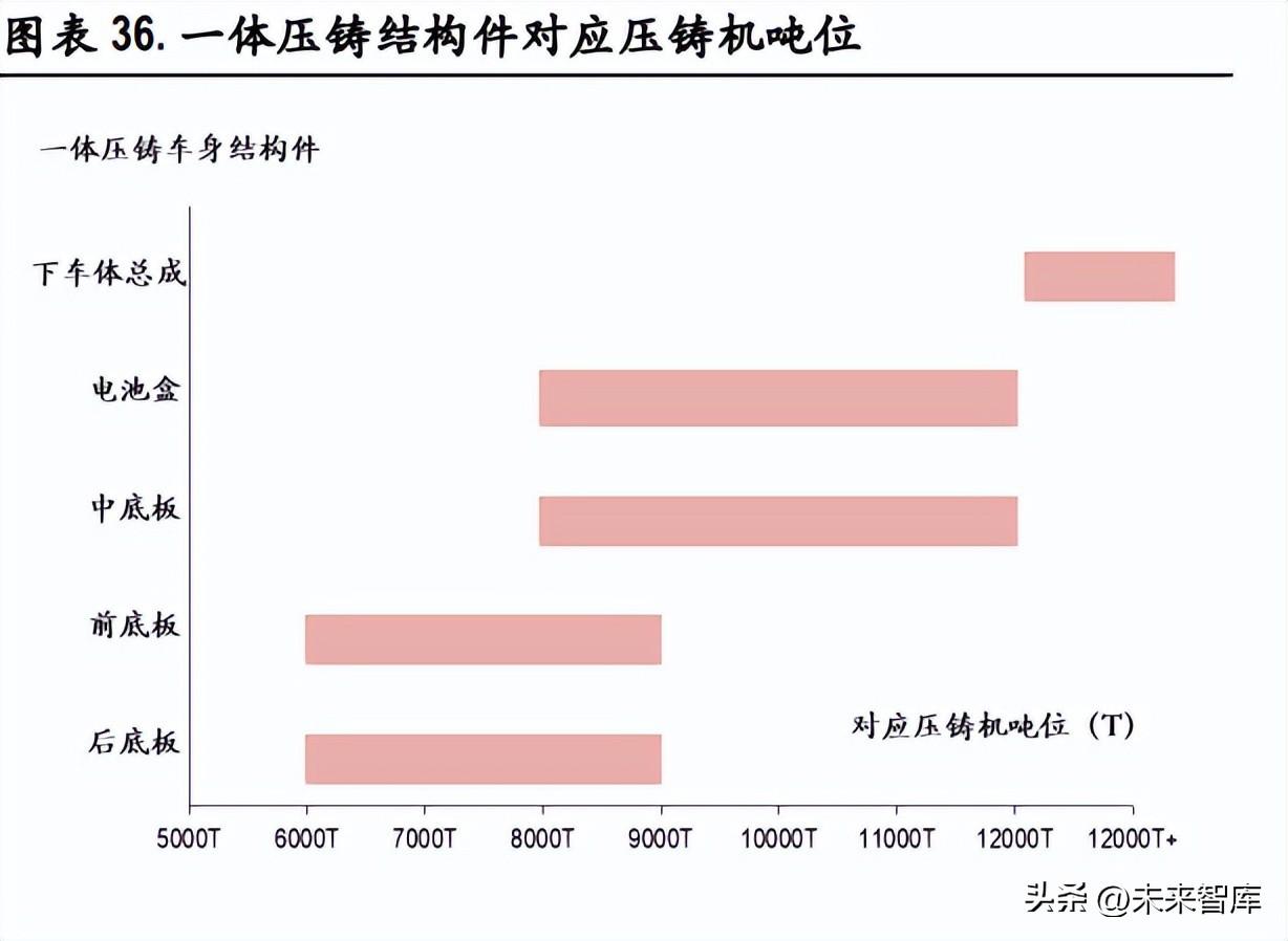 傳統(tǒng)汽車制造包括沖壓、焊裝、涂裝、總裝四大工藝。沖壓是運用中小型壓力機和模具,將板材等 原材料加工為所需形狀和尺寸的沖壓零部件;焊裝是利用多個焊接機器人或工人將沖壓零部件焊接 為分總成,再焊接為白車身;涂裝包括涂裝前對被涂物表面的處理、涂布工藝和干燥三個工序;總 裝是將白車身、動力總成、電控系統(tǒng)、內(nèi)外飾等零部件裝配成整車。 一體壓鑄替代沖壓和焊裝工序,汽車制造迎來重大革新。2019 年 7 月,特斯拉公布新專利“汽車車架 的多向車身一體成型鑄造機和相關(guān)鑄造方法”,該技術(shù)配臵多向壓鑄機、車輛覆蓋件模具和幾個可以 相對于覆蓋件模具平移的凸壓模具,通過將不同凸壓模具移動至鑄造機中央的鑄造區(qū),實現(xiàn)不同部 件的鑄造,在一臺機器上完成絕大多數(shù)的車架鑄造工作,這是一體壓鑄出現(xiàn)在大眾視野中。具 體而言,一體壓鑄技術(shù)將取代傳統(tǒng)汽車制造中為耗時繁瑣的沖壓和焊裝環(huán)節(jié),使用 6000T 及以上 噸位的超大型壓鑄機,將原來需要組裝的若干個鋁合金零件,直接壓鑄成完整的大型零部件,標志 著汽車制造工藝迎來顛覆性革新。