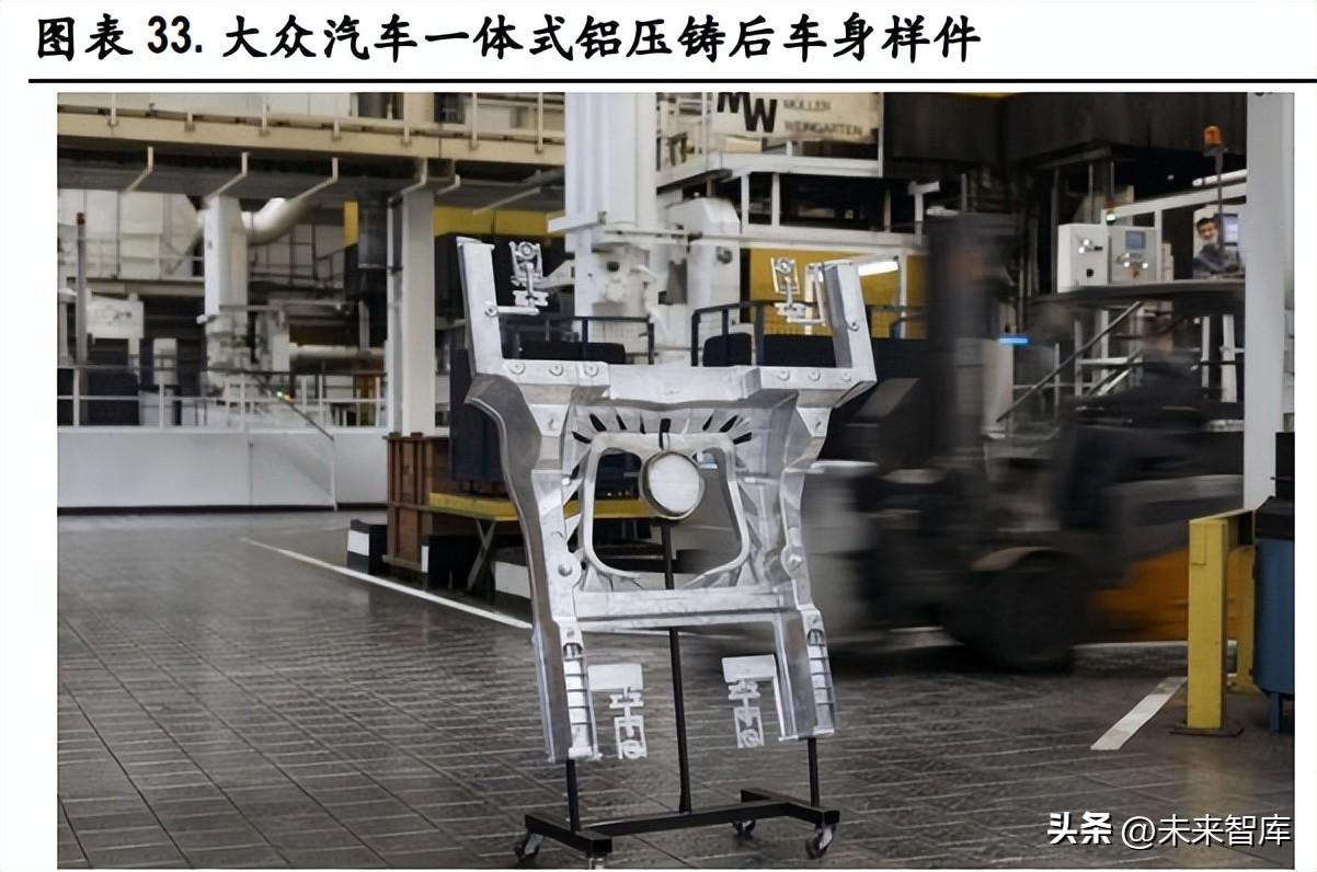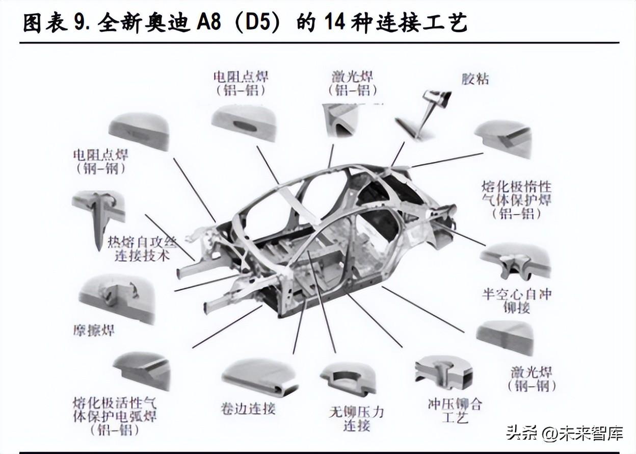 舊工藝下鋁合金成本高率低,新一體壓鑄工藝加速鋁合金滲透。雖然鋁合金在輕量化材料中有較 好的輕量化表現(xiàn)和性價比,但和普通鋼對比時,一方面,鋁合金價格是普通鋼的 2-5 倍,車身鋁合金 占比提高伴隨著高昂的材料成本;另一方面,由于普通鋁合金相對來說韌性差、焊接性能差、加工 成本高,整車廠難以采用 鋁合金打造車體,當車身由鋁合金、高強度鋼、鎂合金和碳纖維材料 等多種材料組成時,異種金屬之間的熱物理化學性能差異巨大,需要優(yōu)化和增加多種車身連接方式。 以全新奧迪 A8(D5)為例,其車身結(jié)構(gòu)中使用 4 種復合材料:鋁、鋼、鎂以及 CFRP 碳纖維高 分子復合材料,奧迪為此提供了包括 MIG 焊、遠程激光焊在內(nèi)的 8 種熱連接技術(shù),以及包括沖鉚連 接、卷邊連接在內(nèi)的 6 種冷連接技術(shù),遠高于鋼制車身的工藝復雜度帶來了較高制造成本和較低生 產(chǎn)率,限制了鋁合金的滲透速度。 但是,新出現(xiàn)的一體壓鑄技術(shù)將改變這一局面,在保留鋁合金輕量化優(yōu)勢的同時,大型結(jié)構(gòu)件大幅 減少了焊接工藝的運用,新鋁合金材料的應(yīng)用優(yōu)化了結(jié)構(gòu)件性能,解決了鋁合金的部分痛點,有望 加快鋁合金滲透速度。以特斯拉為例,相較于車型偏小的轎車 Model 3,更大的中型 SUV Model Y 采取 一體壓鑄工藝制造后地板后,后地板重量僅 66kg,反而降低了 30%。根據(jù) 2020 特斯拉電池日,特斯 拉計劃推動汽車車身一體化結(jié)構(gòu)的設(shè)計,一體壓鑄下車體總成與電池包更好地結(jié)合,能夠?qū)崿F(xiàn)整體 減重 10%,續(xù)航里程增加 14%,提降本果。
