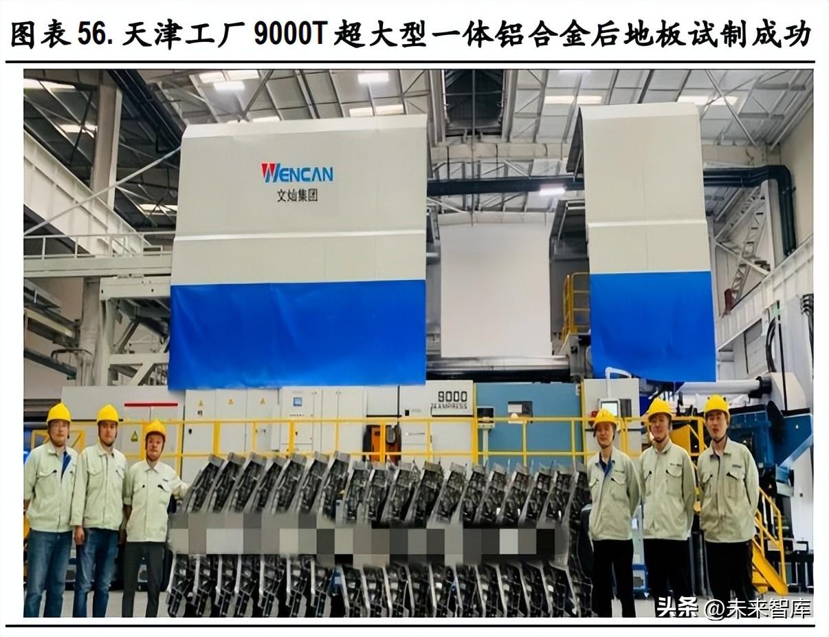 文燦股份布局領(lǐng)先,量產(chǎn)進度與訂單量可觀。文燦股份在超大型壓鑄機購臵、材料合作、模具 開發(fā)、產(chǎn)品試制量產(chǎn)進度、定點訂單方面均領(lǐng)先。在超大型壓鑄機購臵方面,2 臺 6000T 壓鑄機、 天津工廠 9000T 壓鑄機和南通工廠 9000T 壓鑄機均已完成安裝調(diào)試;2022 年 5 月,文燦集團再次向力 勁集團采購 2 臺 7000T 超大型壓鑄機,計劃 2022 年再增加 9000T 壓鑄機 1 臺。在材料合作方面,文燦 集團與立中集團深度合作,保持合作開發(fā)的免熱處理材料采購和供應(yīng)。在模具開發(fā)方面, 子公司文燦模具備自主模具設(shè)計和開發(fā)能力,能夠為一體壓鑄提供配套模具服務(wù)。在產(chǎn)品試制和量 產(chǎn)進度方面,2021 年 11 月,南通工廠 6000T 超大型壓鑄島成功試產(chǎn),并在整車廠完成白車身安裝; 2022 年 4 月,天津工廠 9000T 超大型一體化鋁合金后地板產(chǎn)品試制成功,鑄件尺寸約為 1600× 1400mm, 產(chǎn)品重量約 45-55kg;南通工廠 9000T 壓鑄機對應(yīng)定點產(chǎn)品正在準備試制。在定點訂單方面,文燦是 獲得大型一體壓鑄后地板量產(chǎn)項目定點的壓鑄廠,根據(jù)投資者關(guān)系活動記錄,公司已獲得 多個一體壓鑄產(chǎn)品定點,且產(chǎn)品均試制成功,包括半片式后地板、一體式后地板、前艙和上車體一 體化大鑄件,后續(xù)產(chǎn)品將進入到小批量交樣過程中,預(yù)計在 2022 年第四季度開始貢獻收入。