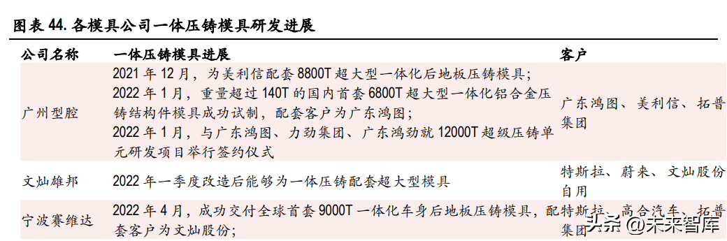 模具商設(shè)計和壓鑄廠自制并存。目前,一體壓鑄壓鑄模具主要有兩種設(shè)計模式,常見的是由專業(yè) 模具商設(shè)計,設(shè)計期間專業(yè)模具商將與壓鑄廠、整車廠深入溝通需求,廣州型腔、寧波賽維達、寧 波臻至的一體壓鑄模具進展較快,其中廣州型腔與廣東鴻圖、美利信均有合作。另一種是壓鑄廠商 自有模具廠進行設(shè)計,目前只有文燦股份具備自研一體壓鑄模具的能力,2022 年一季度改造后文燦 模具已經(jīng)能為一體壓鑄配套超大型模具,廣東鴻圖 2019 年設(shè)立的模具子公司主攻中大型模具,未來 有望自研一體壓鑄模具。