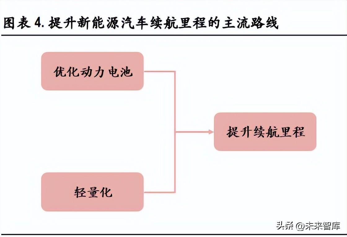 新能源汽車續(xù)航焦慮倒逼輕量化快速發(fā)展。巨量算數(shù)發(fā)布的《2022 中國新能源汽車發(fā)展趨勢白皮書》 顯示,用戶不計劃購買新能源汽車的大原因是續(xù)航里程太短,占比為 59.0%。懂車帝、中國電動汽 車百人會、巨量算數(shù)聯(lián)合發(fā)布的《中國新能源汽車市場洞察報告 2021》顯示,消費者購買新能源汽 車時看重的因素為續(xù)航能力,占比為 46.5%。提升新能源汽車續(xù)航能力,解決消費者里程焦慮迫在 眉睫。新能源汽車續(xù)航能力除了受到電池技術(shù)突破難度較高的限制外,還受到新能源車自身重量的 影響。新能源汽車雖然相較于燃油車減少了發(fā)動機和變速箱,但電池能量密度(鋰電池約 300Wh/kg) 遠低于燃油(汽油約 12222Wh/kg),三電系統(tǒng)較重,疊加智能化配臵,新能源汽車整車質(zhì)量較燃油 車重 10%-30%。根據(jù) The Aluminum Association 研究,新能源汽車減重 10%和 15%可分別減少 6.3%和 9.5% 的電能消耗。根據(jù) 2019 汽車輕量化大會內(nèi)容,若純電動汽車整車重量降低 10%,則平均續(xù)航里程將 增加 5%-8%。所以通過輕量化方案提升新能源汽車續(xù)航里程成為熱點技術(shù)路線。