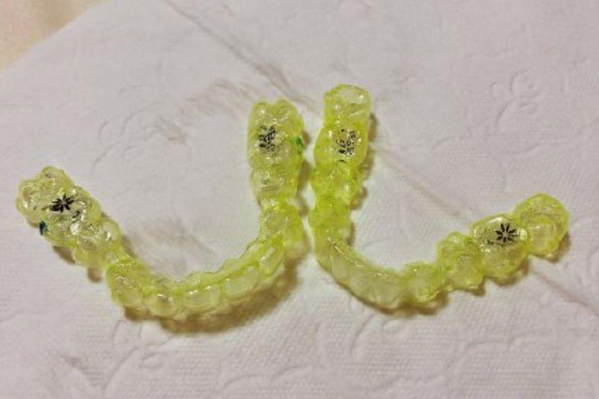 Simone :“吃東西不能隨心所欲了!染色的不能亂吃!我之前偷懶試過戴著牙套喝了兩口咖喱,結(jié)果牙套變成熒光黃,戴牙套喝咖啡和烏龍茶牙套變成棕色。吃纖維粗的蔬菜和肉類一定會塞牙!”