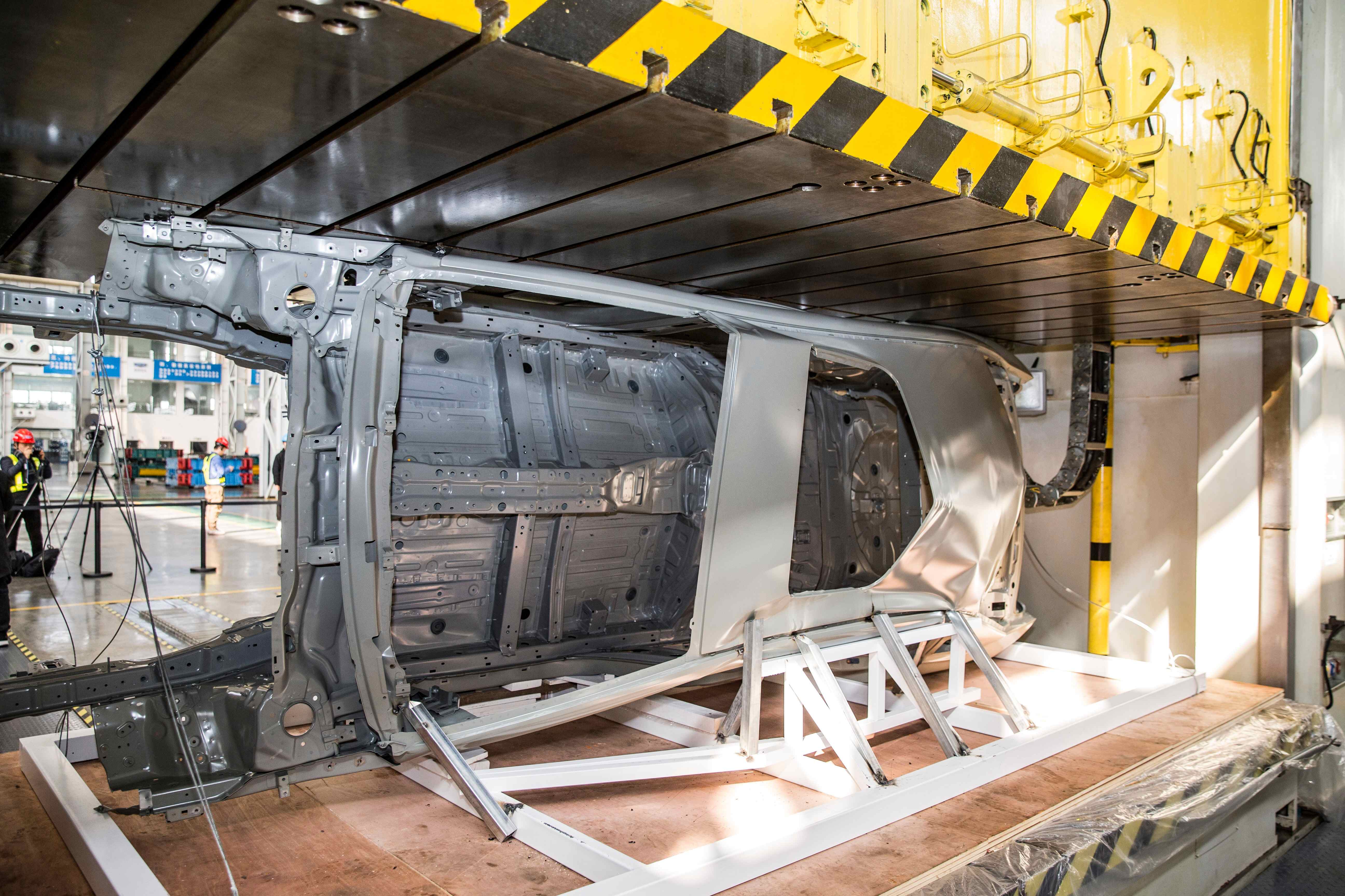 “極限沖壓測試”是體現(xiàn)帝豪GL車架出色設(shè)計的另一直觀測試。吉利將帝豪GL的側(cè)面置于工業(yè)沖壓機下,利用沖壓機擠壓帝豪GL白車身,通過觀察車身的形變情況和壓力數(shù)值變化即可獲得帝豪GL的抗壓峰值。這一峰值現(xiàn)場測得的這一數(shù)值為196KN,亦高于此前企業(yè)的預(yù)期數(shù)值。