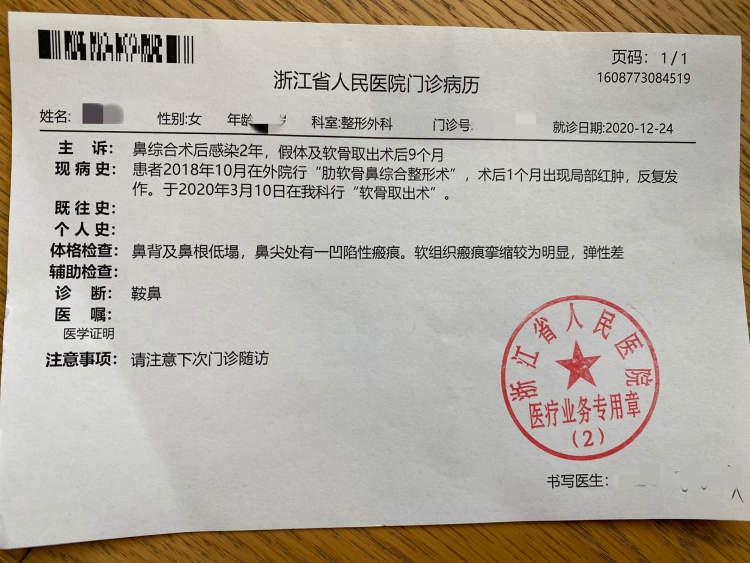 杭州的尚小姐本想讓自己的容貌更耐看些,在別人的帶領(lǐng)下,來到上海瑰康醫(yī)療美容門診部(以下簡(jiǎn)稱“瑰康醫(yī)美”)做隆鼻手術(shù)。不料鼻子術(shù)后發(fā)炎,植入假體不得不取出來,在鼻尖上留下顯而易見的癜痕,也就是破相了。而此時(shí),這家醫(yī)美門診已經(jīng)改名為“上海梵麗醫(yī)療美容門診部”(以下簡(jiǎn)稱“梵麗醫(yī)美”)。