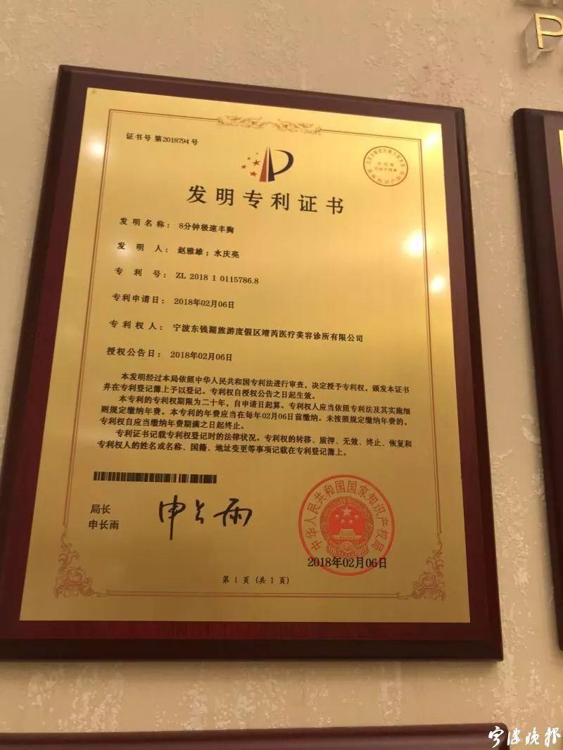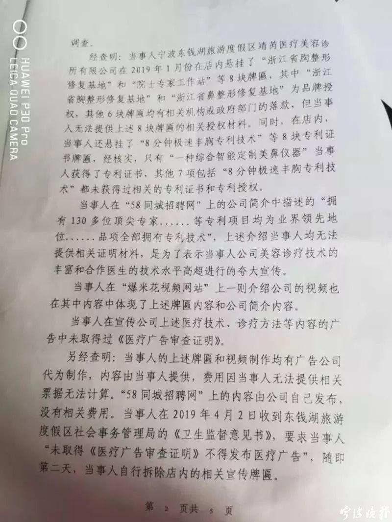 記者注意到,東錢湖市監(jiān)分局10月12日發(fā)布的行政處罰決定書中,認定當事人無法提供“浙江省胸整形修復基地”和“院士專家工作站”等8塊牌匾的相關授權(quán)材料,經(jīng)核實“8分鐘極速豐胸專利技術(shù)”未獲得相關的專利證書和專利授權(quán),當事人在宣傳上述醫(yī)療技術(shù)、診療方法等內(nèi)容的廣告中未取得過《醫(yī)療廣告審查證明》……責令其停止發(fā)布廣告,在相應范圍內(nèi)消除影響,并罰款20000元整。