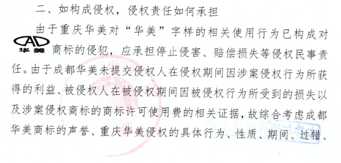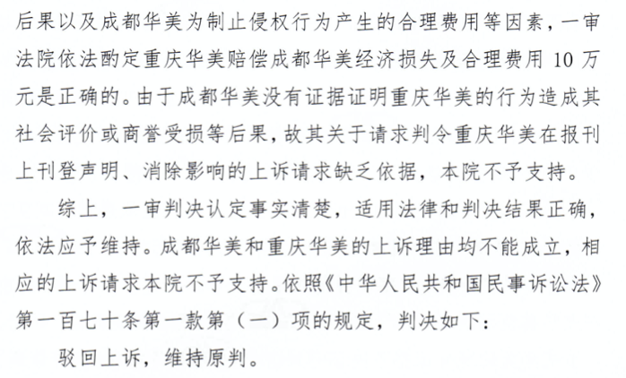 不過,重慶高級人民法院認(rèn)為重慶華美不構(gòu)成不正當(dāng)競爭和商標(biāo)侵權(quán)。綜合各方面因素考慮,酌定重慶華美賠償華美牙科經(jīng)濟(jì)損失及合理費(fèi)用10萬元。同年,上海華美被判賠償15萬元。