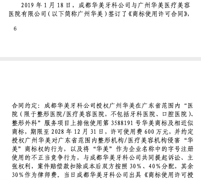 淮安市中級人民法院民事判決書((2021)蘇08民初896號)顯示,2019年1月18日,華美牙科與廣州華美于簽訂了《商標(biāo)許可使用合同》,合同約定廣州華美在廣東省范圍內(nèi)“醫(yī)院、整形外科”服務(wù)項(xiàng)目上排他使用華美商標(biāo)及相近似商標(biāo),期限至2028年12月31日,許可使用費(fèi)600萬元。