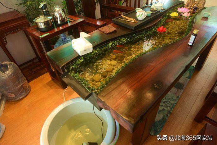 茶室區(qū)有創(chuàng)意就是這個可以養(yǎng)魚的茶桌。據(jù)說是老船木做的茶桌椅,茶桌中間放置著循環(huán)流水養(yǎng)魚,隨著水流動魚兒在水中游來游去,人們在兩邊品茶交談,有景有茶再配上音樂,瞬間要作詩一首!