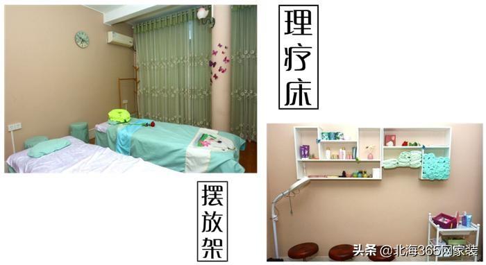 理療床繼續(xù)延續(xù)粉色墻面+綠色的溫馨舒色調(diào)。這個房間有個硬傷就是柱子,它切割整個房間小辦區(qū)域,但是還不能打掉,有點尷尬。怎么好呢?