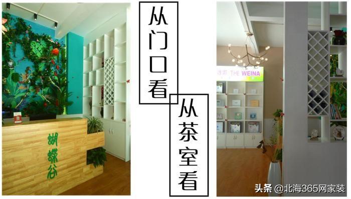 森林風的背景墻隔壁是起到阻隔視線和產(chǎn)品擺放的隔斷柜。其實剛開始是沒想到要做一個柜子的,某一天老板娘從門口進來,發(fā)現(xiàn)第一眼看到的居然是休憩間里那幾個整個吃午餐的員工,瞬間覺得不雅觀,于是就有這個能隔斷視線又能儲物的隔斷柜。