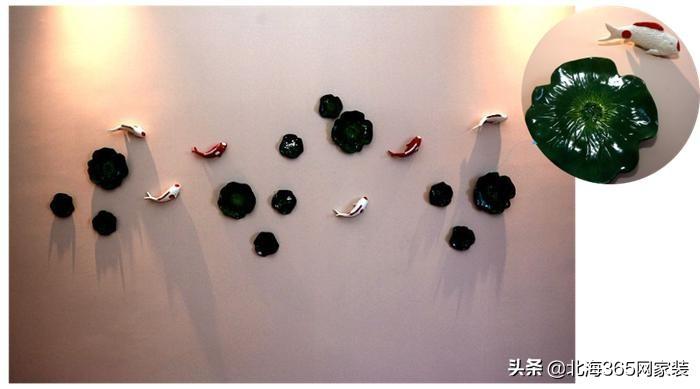 淺粉色的背景墻被筒燈的襯托下,墻上的荷葉和金魚更加立體有質(zhì)感。這是當下很流行的墻面裝飾--掛盤子裝飾。當然你們也別擔心掉下來的問題,掛件下是做了很牢固的處理的。