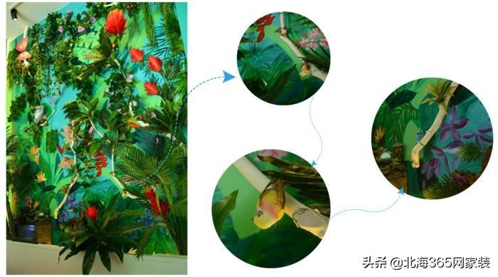 首先,你們看到的這面綠油油的背景墻底部是設(shè)計師用涂料手繪畫上去,在仿真的花草下面有設(shè)計師設(shè)計自己花的花花草草,這樣才會顯得有森林密集的視覺。然后,就是仿真花草,雖然網(wǎng)淘可以淘到,但是要一件件搭配,一枝干支還是一只小鳥都需要合理的擺放才不會讓背景顯得突兀。擺放這些東西設(shè)計師還要去微調(diào),所以大家看著很美的東西后得以呈現(xiàn),是花費設(shè)計師很多的心血的。