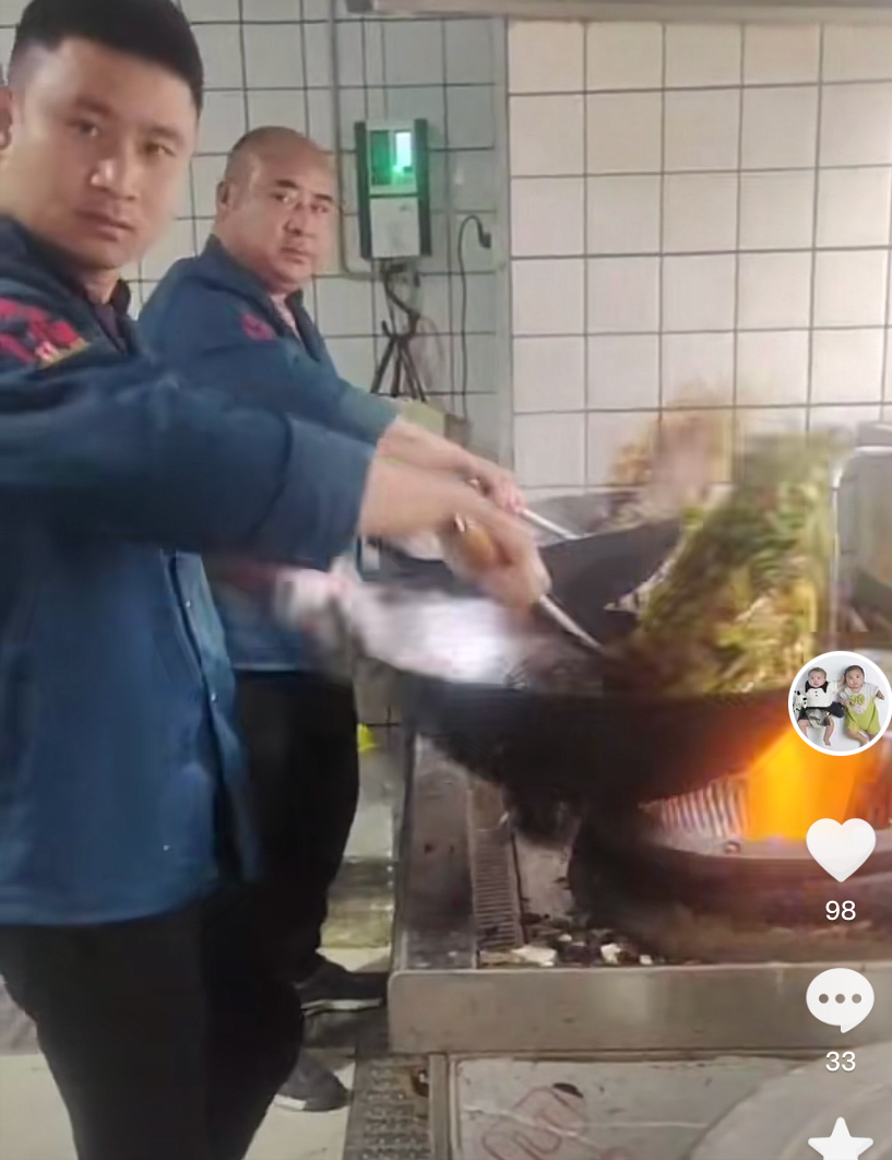 盼盼老公忙著炒菜(右一)