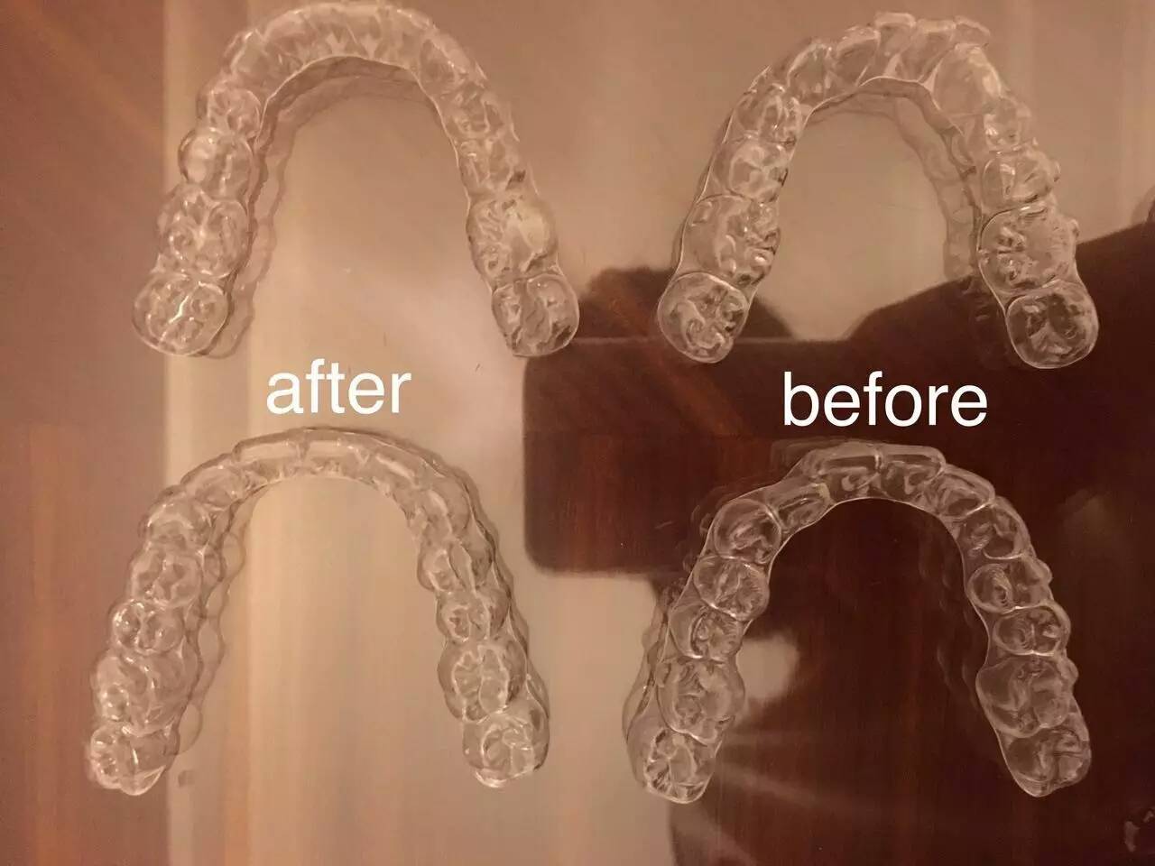 因為她的工作需求,所以自己覺得不適合戴鋼絲牙套。于是專家建議她做隱形矯正,這是她矯正之前用的隱形牙套。前后對比能看出牙套的輪廓都變得整齊自然了。