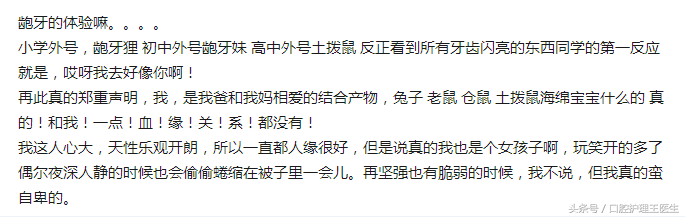身邊有一些朋友牙齒長的比較外突,嚴(yán)重點的嘴巴會經(jīng)常合不攏,這種情況就是我們常說的齙牙了,齙牙的基本表現(xiàn)為開唇露齒,牙齦露出比較多;在自然狀態(tài)下雙唇不能閉攏,強(qiáng)制閉上嘴巴后會有的外突;口腔的上下前牙外傾等。那么齙牙是一種什么樣的體驗?zāi)??我們來看看知乎的網(wǎng)友們怎么說:
